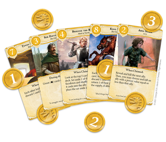 In addition to claiming the ally, the winner of the bid gets to add a random power token (without looking at its numbered side) to one of their councils as well. Remember that you can choose which council to place the ally and power token in (unless otherwise stated by an ability), and that you share each of your councils with another player, so choose carefully when claiming an ally! Of course, the allies themselves are worth more than just their power values; some, such as Tywin Lannister and Hodor , have “When Claimed” abilities that trigger once somebody wins a bid. Others, such as Ser Davos Seaworth and Benjen Stark , have “During this Round” abilities, which add additional rules to the bidding phase. Some allies, such as Mance Rayder , have negative power values, which can be used to sabotage the other players. Other allies, such as Sandor Clegane , can even kill an ally in someone’s council, setting the ally aside in a “dead pile” and out of play, which could significantly swing the power balance of the game. The opportunities are endless!