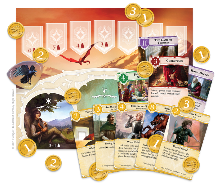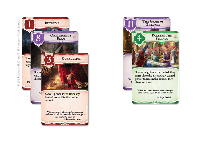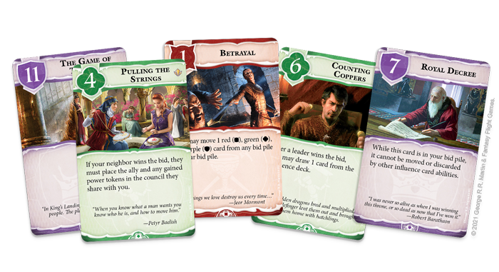 However, influence cards are more than just numbers; they also have a wide variety of abilities that can shake up the game depending on when they’re played. Gossip & Lies can force a player to discard a card from their hand while Counting Coppers lets you draw a card for a later round of bidding. If you know you’re going to lose a bid to one of your neighbors, you can use Pulling the Strings to ensure that you still get the ally added to one of your councils. And while the massive 11 influence from The Game of Thrones may seem enticing, you must be wary of a Betrayal turning your own cards against you!