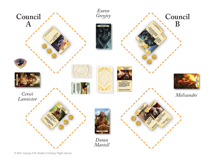 Each player has two “councils”: one to their left, and one to their right. Whenever you gain an ally or a power token, you can choose which of your councils you want to place them in. However, there is a catch: you share each of your councils with another player, which means whenever you add power to one of your councils, you add it to one of theirs as well. Your council with the lower total power is your “small council,” and you’ll want it to have more power than anyone else’s small council at the end of the game.
