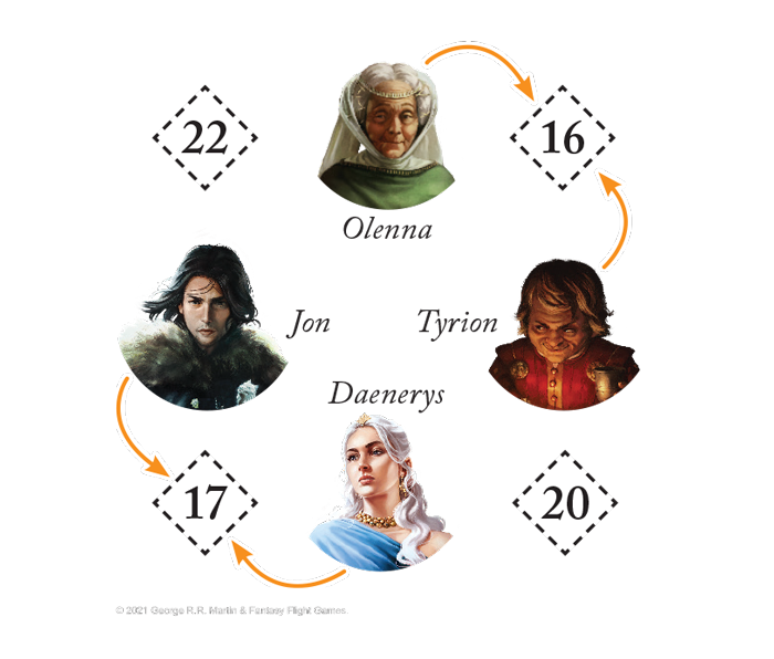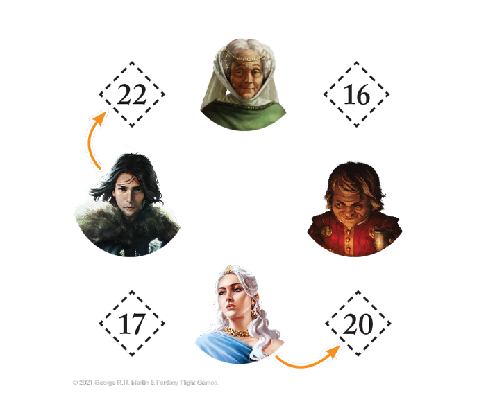 At the end of winter, the game is over. To determine the winner, each player first flips the power tokens in their councils over to their numbered sides. Then, for each council, the players add up the power values of the allies and power tokens in that council to determine its power total. When all the adding is done, players compare the power values of their small councils—whoever has the most powerful small council wins!