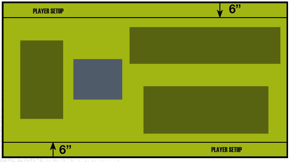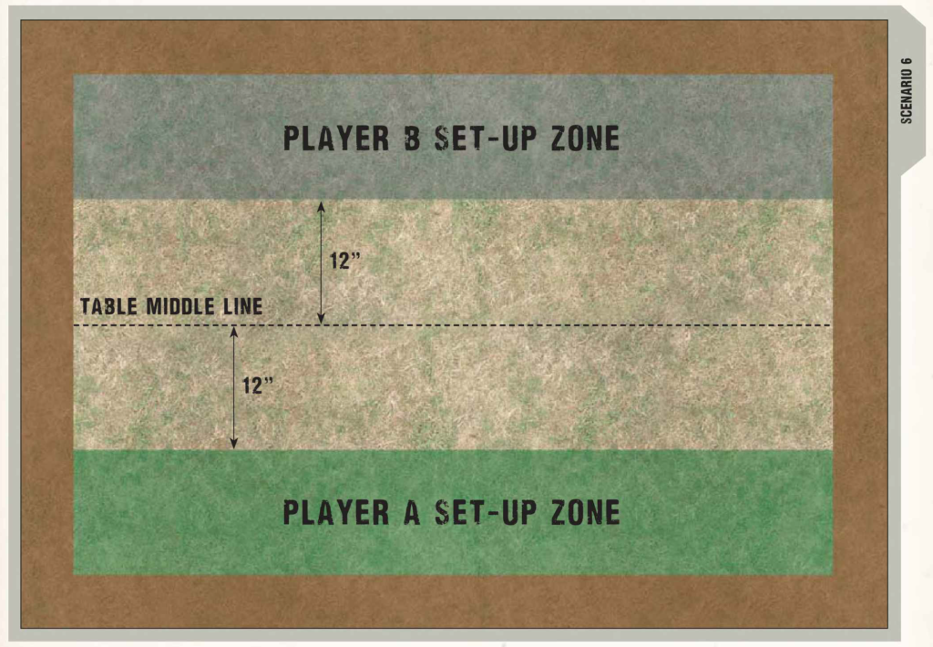 The 1st round deployment zone is as shown above. This is a rolling in deployment… meaning you come into the map at turn 1 with your activation. You may fire or advance when you come in. When coming in, you MUST end your turn IN your deployment zone. This is also true for units in reserve which are coming in at later rounds. However, units that are declared as flanking CAN ONLY come in at ROUND 3 at your NEAREST NEUTRAL corner OR ROUND 4 at the OPPOSING NEUTRAL corner. They will still follow the checks to come in and will still need to declare before game start at which corners the flanking unit is coming in from.