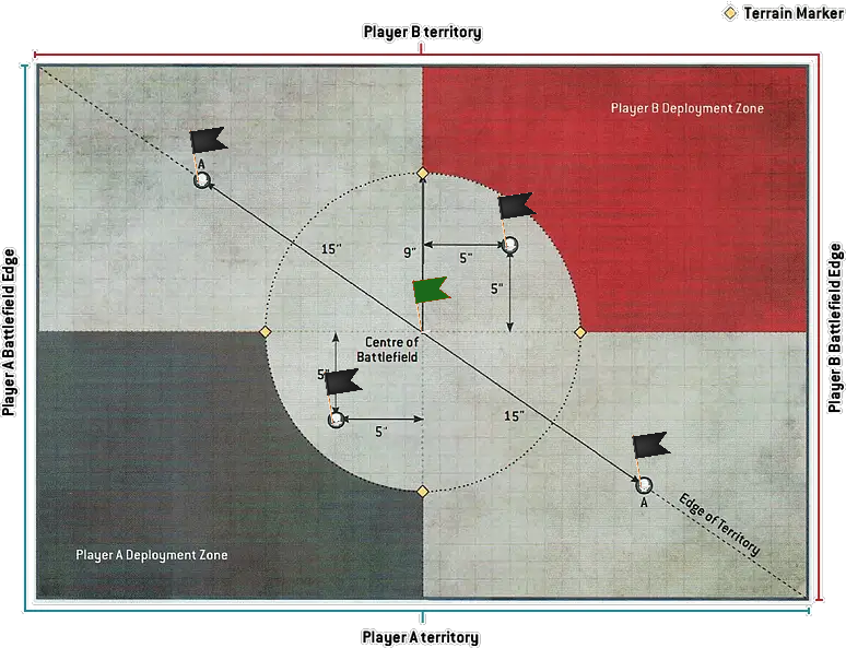 Its a rush to the control the objective. It so happened that HQ at both sides determined that the locations (objective) are of strategic importance. There are 5 objectives on the map. 4 of the locations (black flags), when controlled at the end of round 6 … will be granted 2 points. The central objective which is green in color, will be worth 4 points. Whoever is controling the objectives with the highest accumulated points will win.