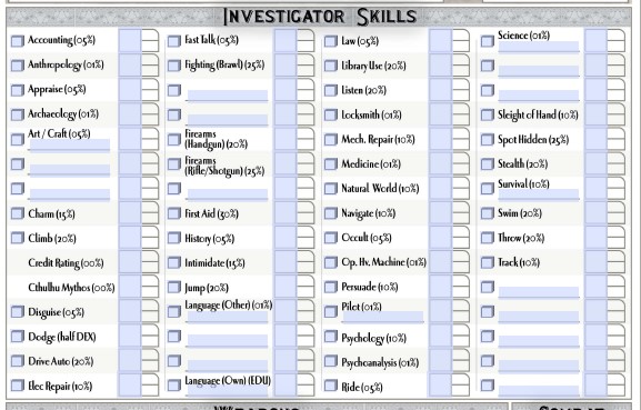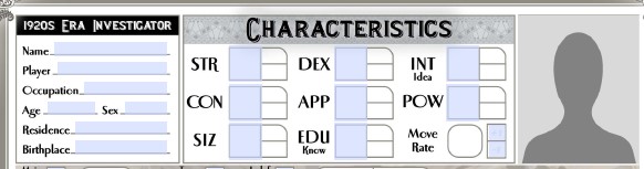 Download this chracter sheet to start. This is the standard 1920 Cthulhu era which we will be using as reference.