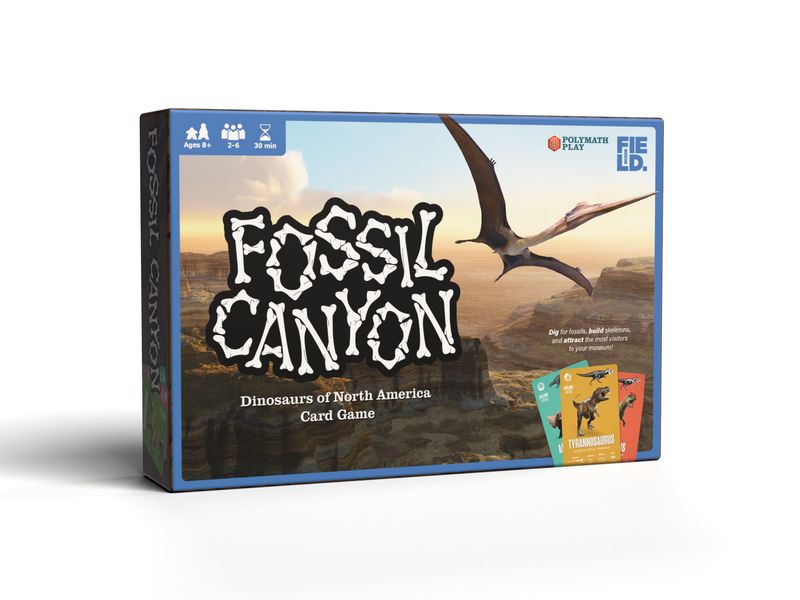 Fossil Canyon is a competitive, lightly-strategic set-collection card game developed in collaboration with the Field Museum of Chicago. You are a fossil-hunting paleontologist with the goal of constructing complete dinosaur skeletons that attract visitors to your museum. Each dinosaur skeleton has a different point value (represented as visitors per year) and may consist of two, three, or four unique fossils.