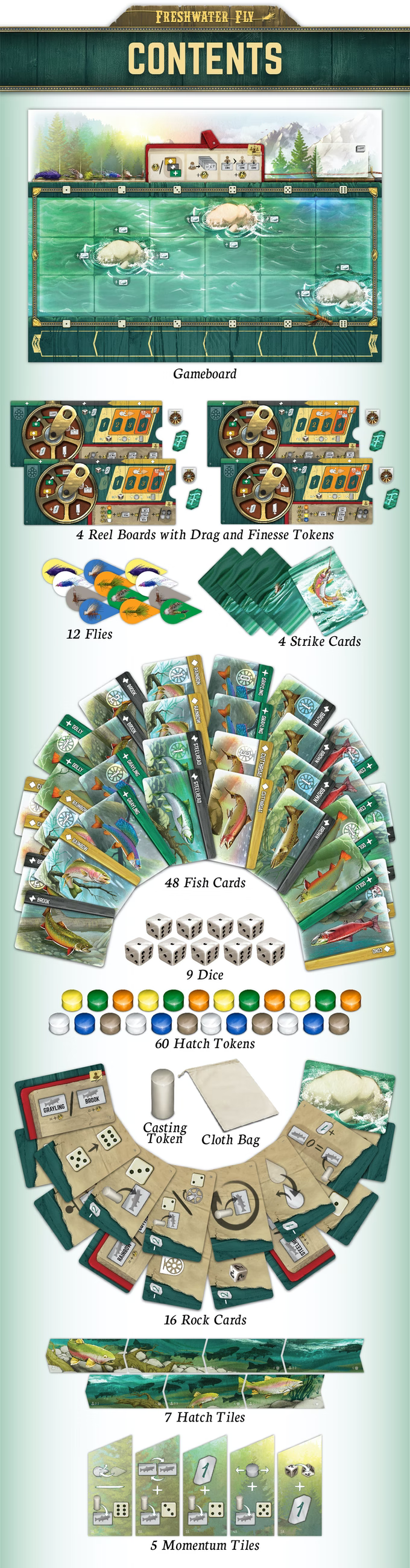 Freshwater Fly is a dice drafting game combined with a push your luck mechanism. On each turn, players have three choices 1) Cast 2) Reel 3) Increase finesse. The objective of the game is to score the most points by catching trout and salmonoid species from the river and collecting bonuses. Players will need to be as efficient as possible with each of their actions to succeed in the game. Careful planning and strategy are key to maximizing your catch.