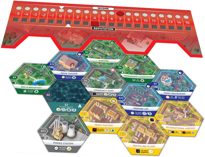 One of the unique aspects of Suburbia is that each player’s city has a unique dynamic based on the tiles they choose and how they place them. Players must constantly adapt their strategy to stay ahead of their opponents and create the most prosperous and populous city.
