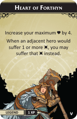 Similar to skills, legends are double-sided cards that you unlock as you play through the campaign, and they cost Experience (XP) to equip. However, unlike skills, you can’t ever flip these cards; when you unlock them, you choose which side of the card to gain, and then you have access to that legend (while locking out its other side) for the rest of the campaign. Legends never cost any fatigue or actions to use—their abilities are always in effect!