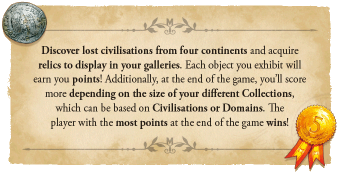 To gain even more points, you can create collections by positioning cards adjacent to one another on your player board, much like in a real museum. Collections can be based on one of the twelve different civilizations in the game, or on the 6 different archaeological domains, so combine your cards creatively to get the highest score!As well as being a fun experience, the Museum board game is also rich in historical content. The cards feature over 300 unique illustrations by the inimitable Vincent Dutrait, including 180 unique artefacts. All of the objects and places in the game are real, and the information included on each card is factual.